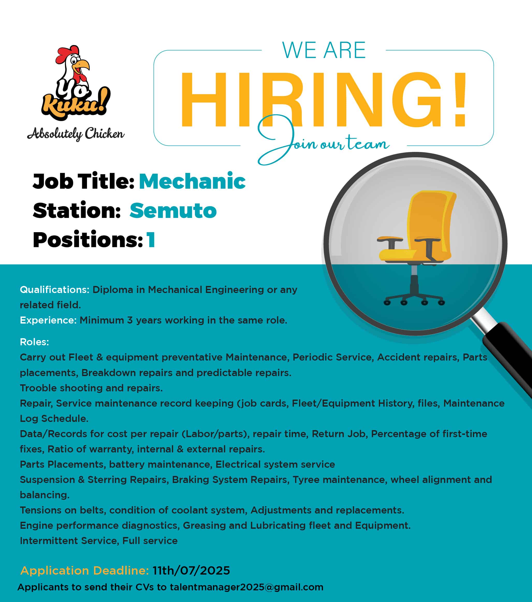 •  – Diploma in Mechanical Engineering or any related field.